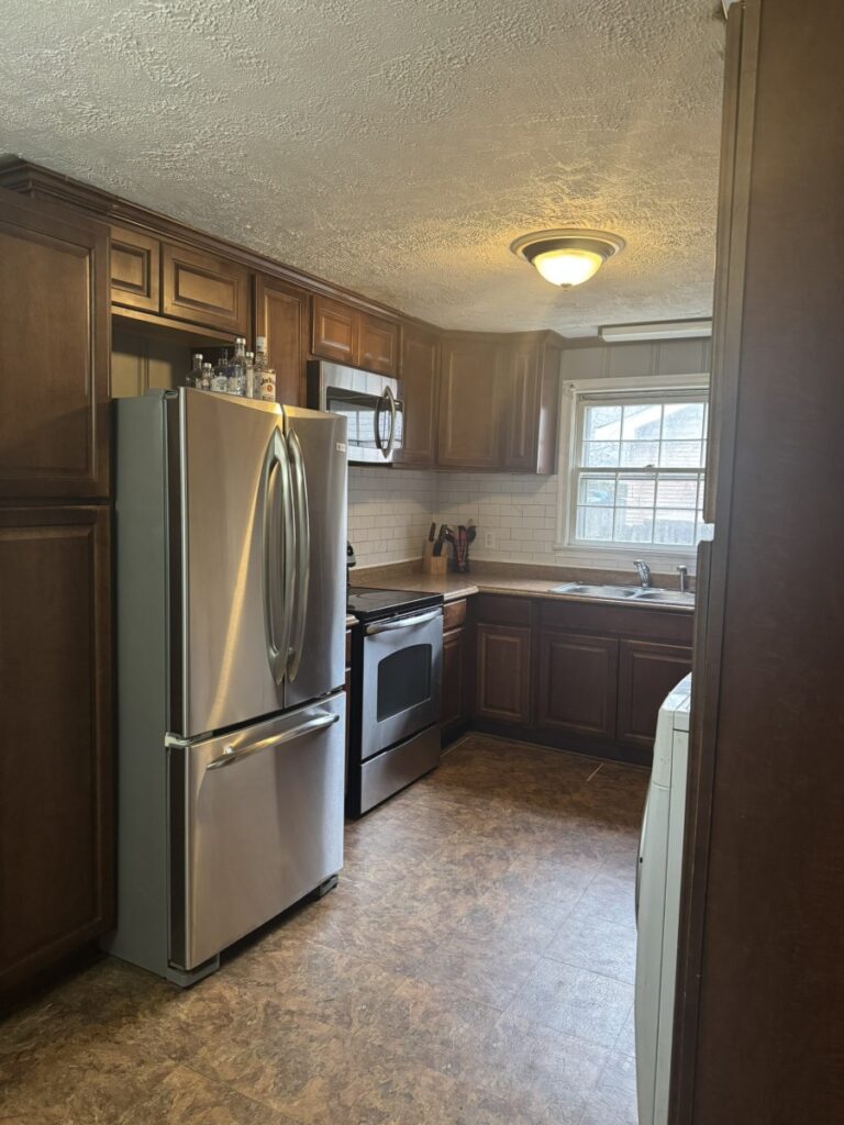 - Eat-in kitchen with stainless refrigerator, stove & built-in microwave